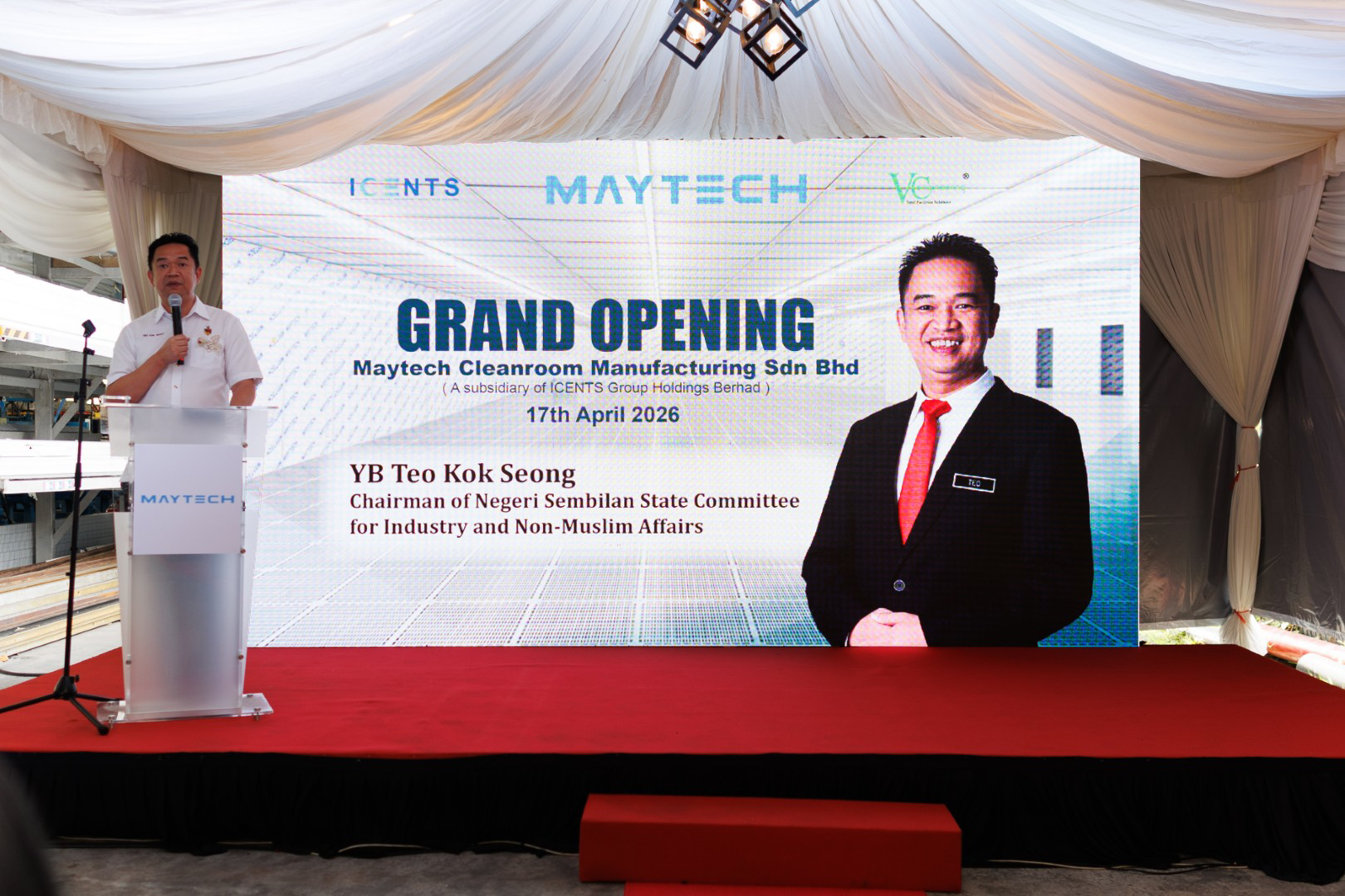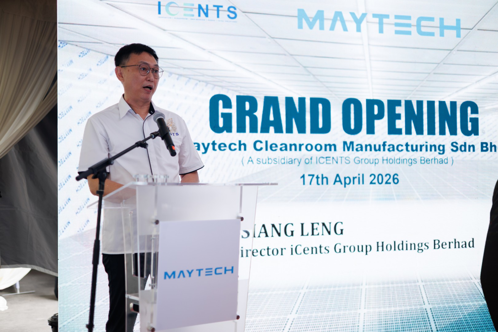 Kuala Lumpur, 17 April 2026 – iCents Group Holdings Berhad (“iCents” or the “Group”), a specialist in the design, engineering, procurement, construction and commissioning (EPCC), qualification and validation of cleanrooms, and the manufacture of cleanroom fixtures and related products, today marked the official launch of Maytech Cleanroom Manufacturing Sdn Bhd (“Maytech”), a wholly-owned subsidiary of iCents, at its facility in Mantin, Negeri Sembilan.